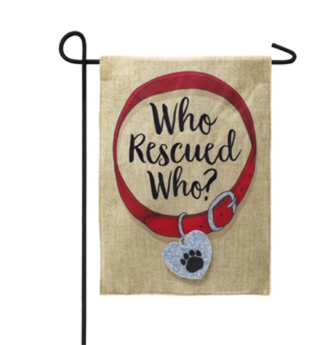 WHO RESCUED WHO BURLAP GARDEN FLAG